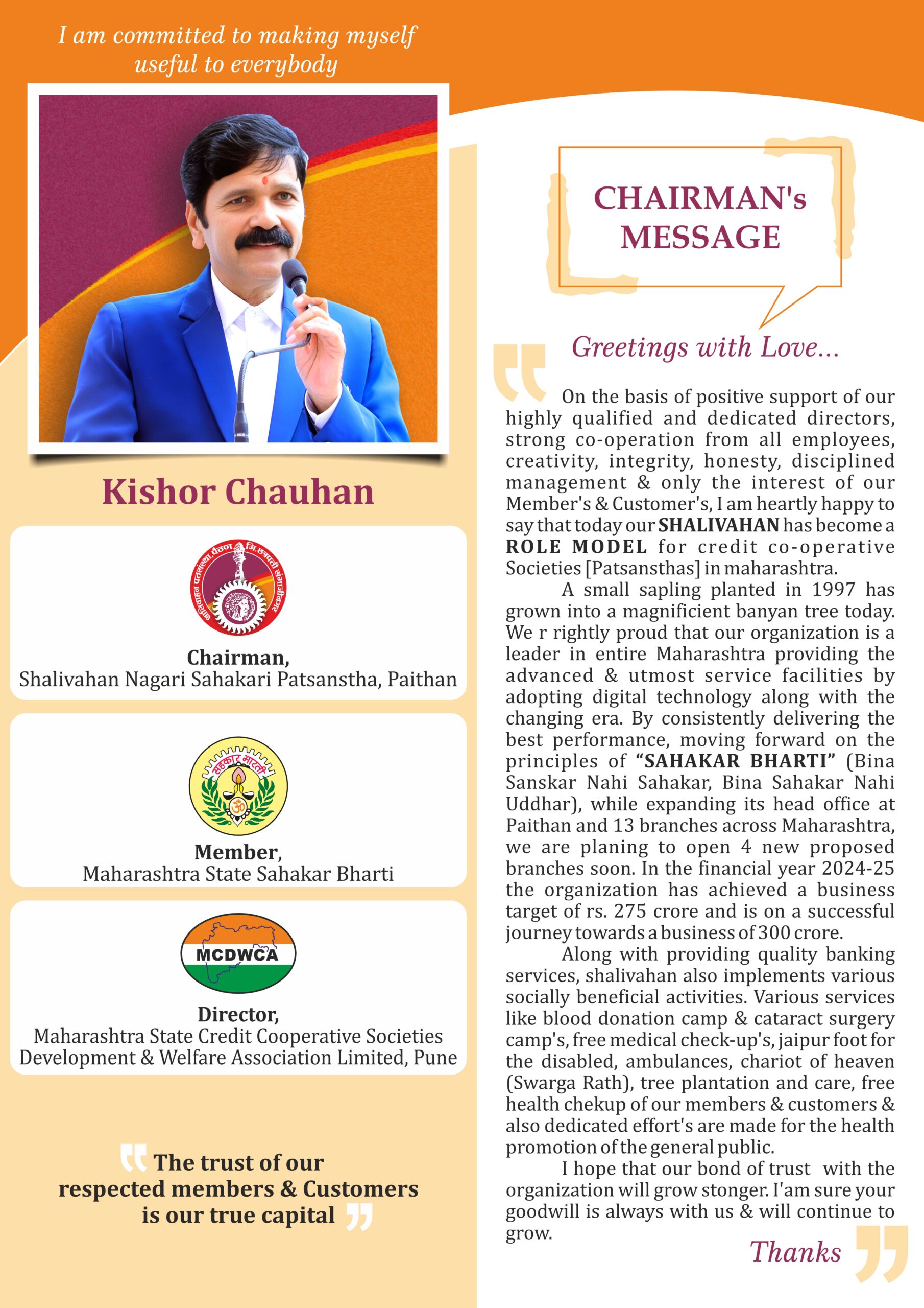 On the basis of positive support of our highly qualified and dedicated directors, strong cooperation from all employees, creativity, integrity, honesty, disciplined management & only the interest of our Member’s & Customer’s, I am heartly happy to say that today our SHALIVAHAN has become a ROLE MODEL for credit institutions [patsansthas] in maharshtra.